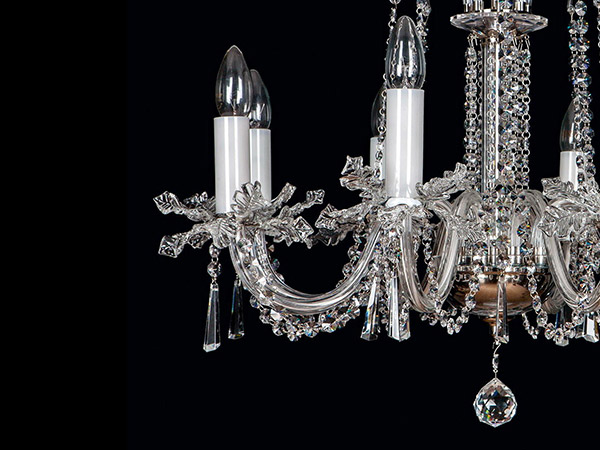 Aseconda della funzione del lampadario, i materiali più usati sono: vetro, cristallo, ferro battuto, Swarovski, alabastro, fogli d’oro e i fogli d’argento.